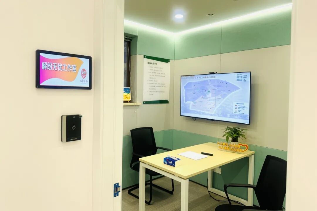 “枫和暖杨”解纷中心设有“心灵彩虹”“解纷无忧”“枫和安澜”三个特色工作室,分别提供免费心理咨询、免费法律咨询、妇女儿童权益保护服务。